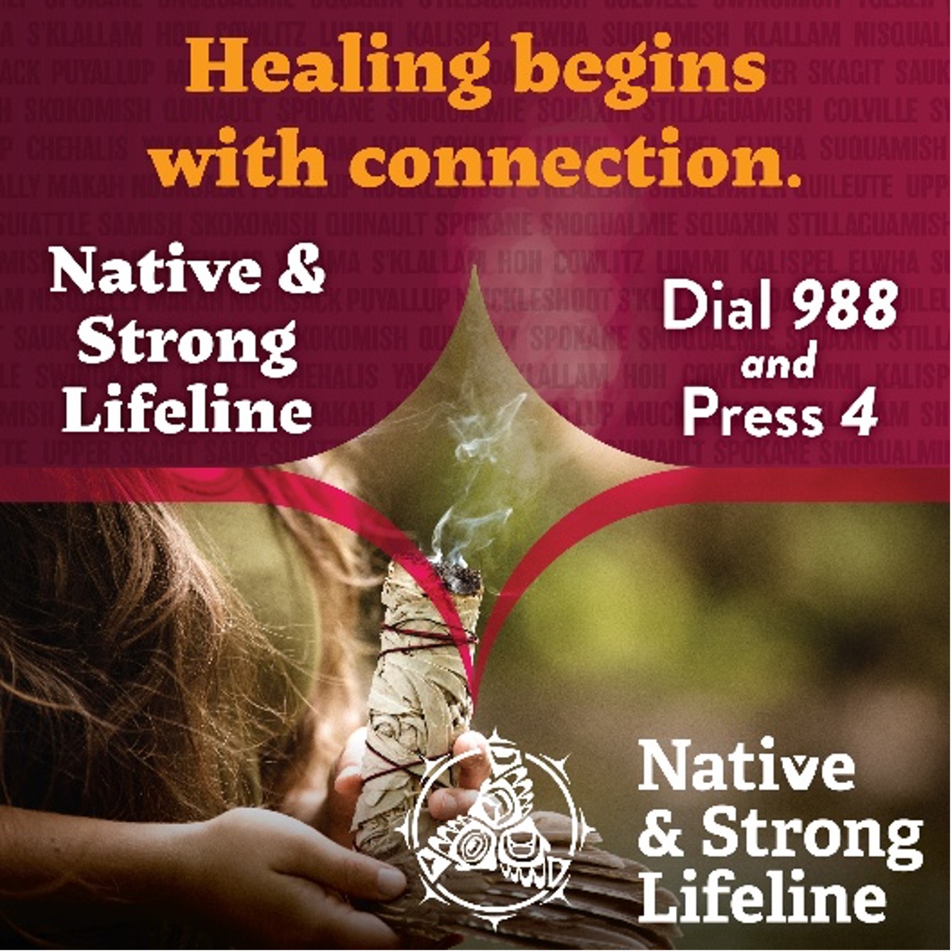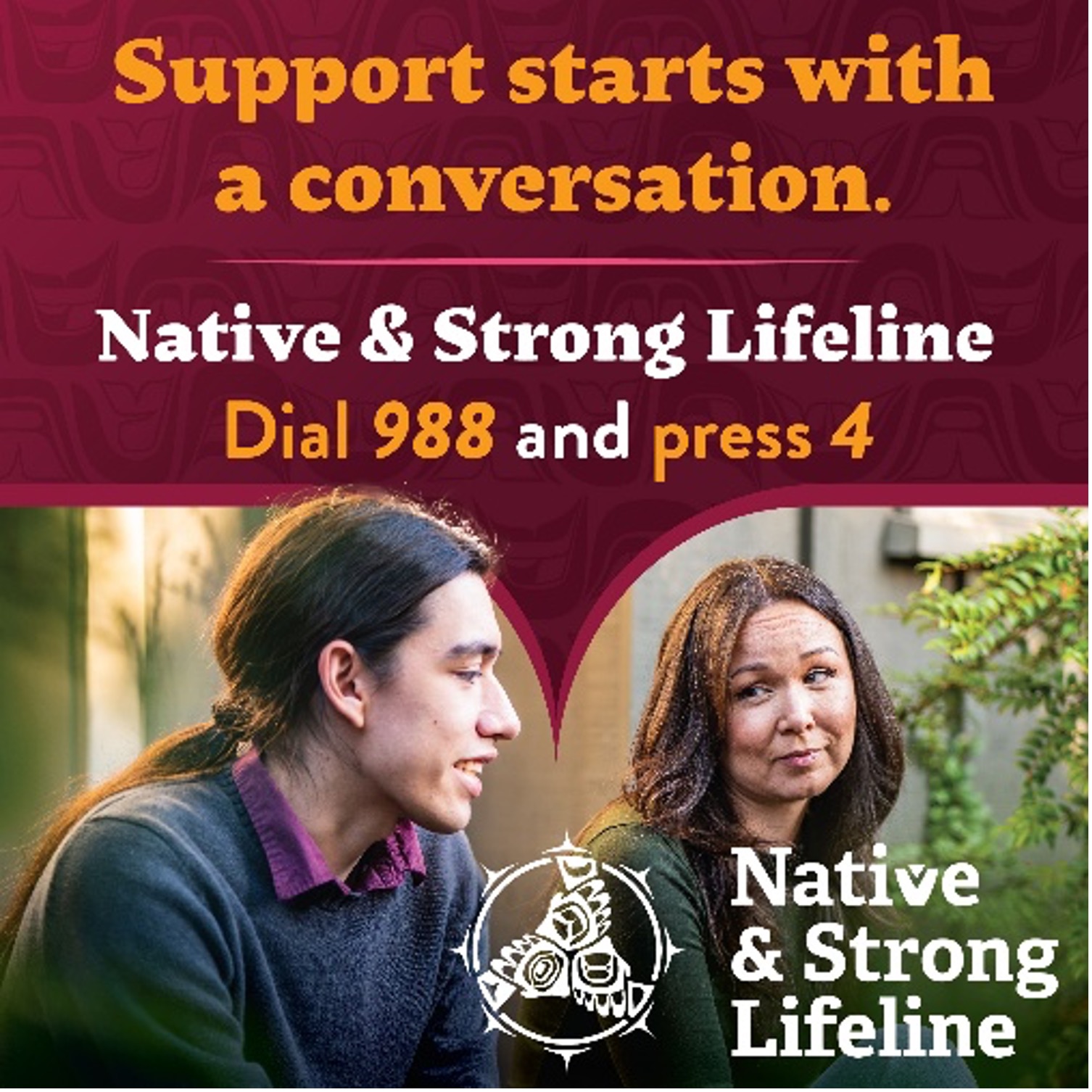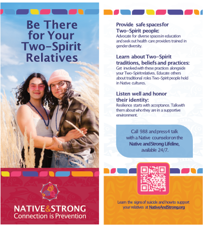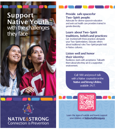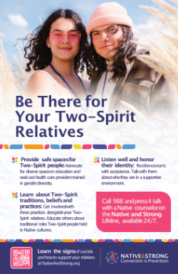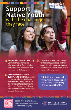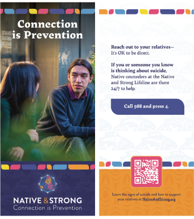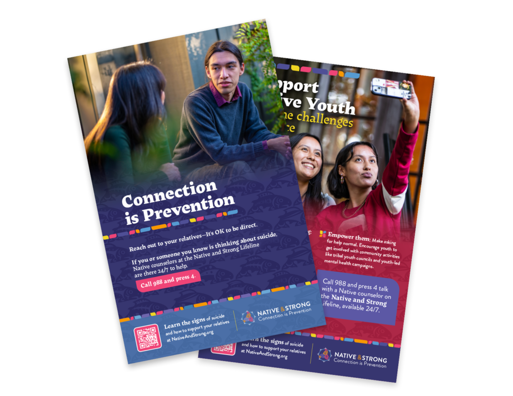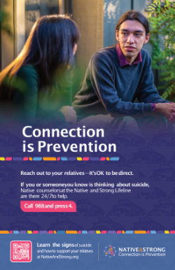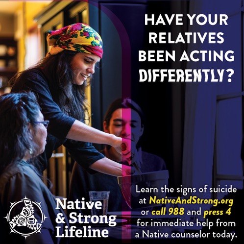 Learn the signs of suicide at NativeAndStrong.org and call 988 and press 4 for immediate help from a Native counselor today.