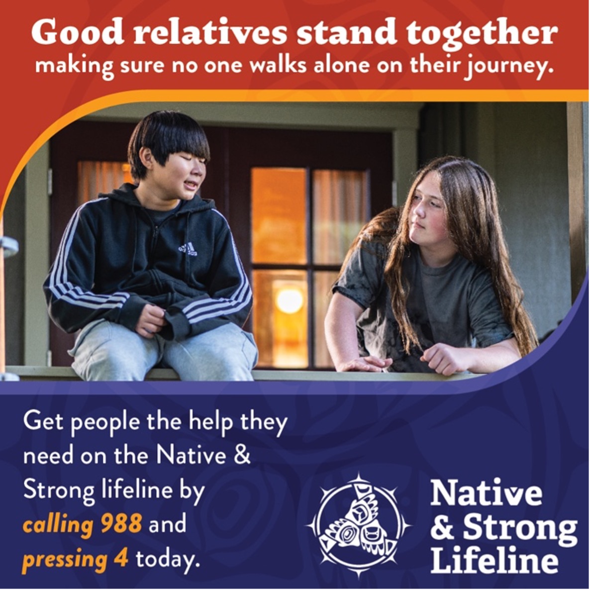 Good relatives stand together making sure no one walks alone in their journey. Reach out, check in and ask questions. And get people the help they need on the Native & Strong Lifeline by calling 988 and pressing 4 today.